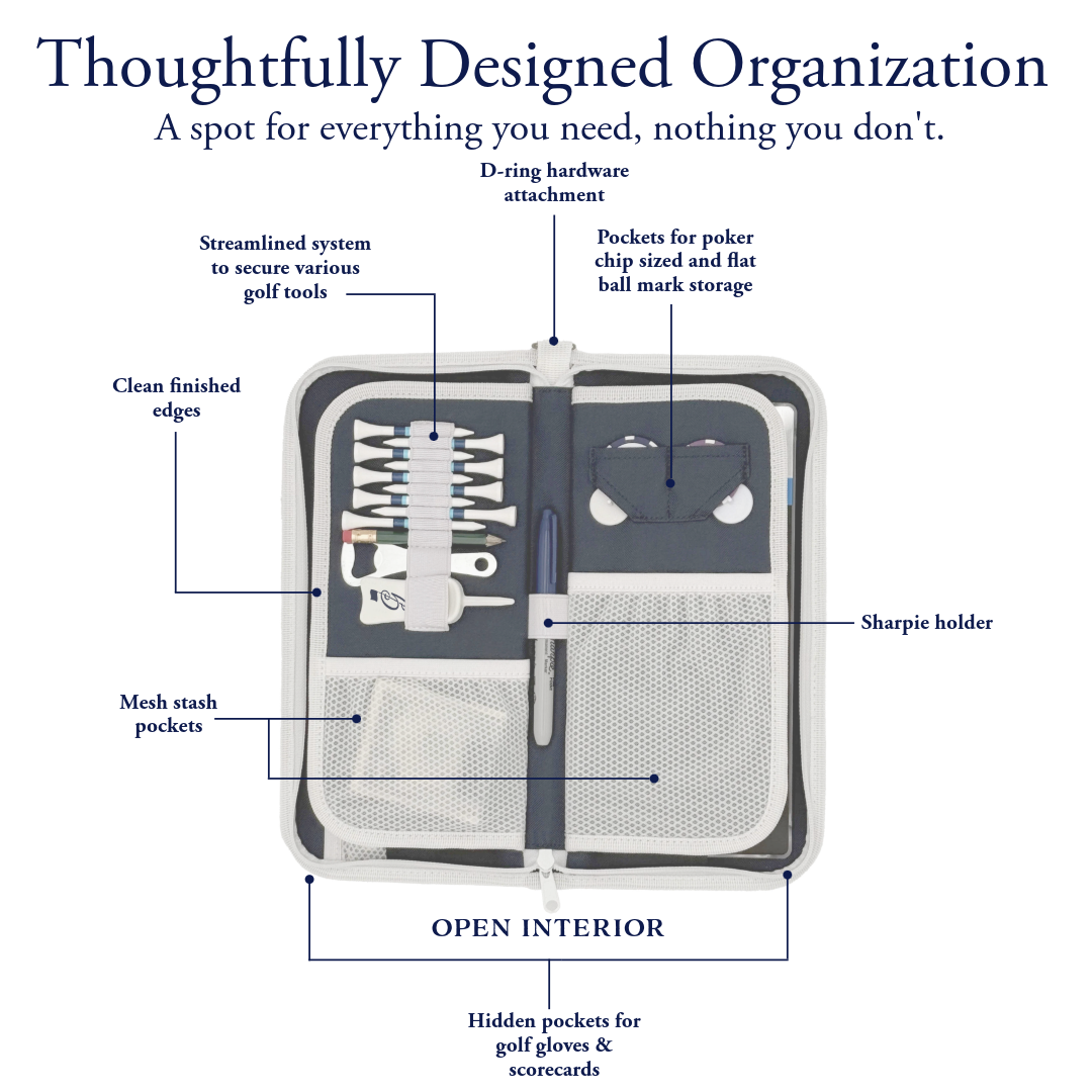 It includes dedicated slots for just enough tees, ball markers, pencils, divot tools, golf gloves, scorecards, cash, a phone, keys, a rangefinder battery, an AirTag, and more!
