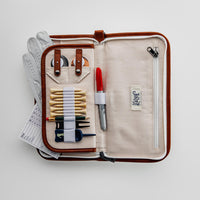 It includes dedicated slots for just enough tees, ball markers, pencils, divot tools, golf gloves, scorecards, cash, a phone, keys, and more!
